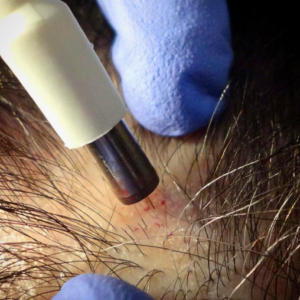 O laser fracionado não-ablativo é uma tecnologia avançada e indolor utilizada para estimular o couro cabeludo e melhorar a permeação de substâncias ativas (“drug delivery”). Por meio de feixes de luz controlados, o laser cria microzonas de tratamento na pele, estimulando a produção de colágeno e aumentando a circulação sanguínea no couro cabeludo. Isso resulta em um melhor fornecimento de nutrientes e oxigênio para os folículos pilosos, promovendo o crescimento e fortalecimento dos cabelos.